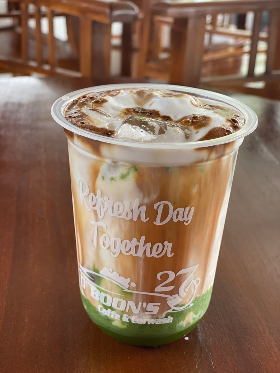 Step inside and you'll be greeted by a welcoming atmosphere, where modern touches meet a relaxed vibe. Whether you’re catching up with friends or enjoying a quiet moment alone, D'BOONS provides an inviting space—perfect for those laid-back hangouts. The ambiance is enhanced by the funky sound of karaoke drifting from the upper level, which invites you to join in on the fun.